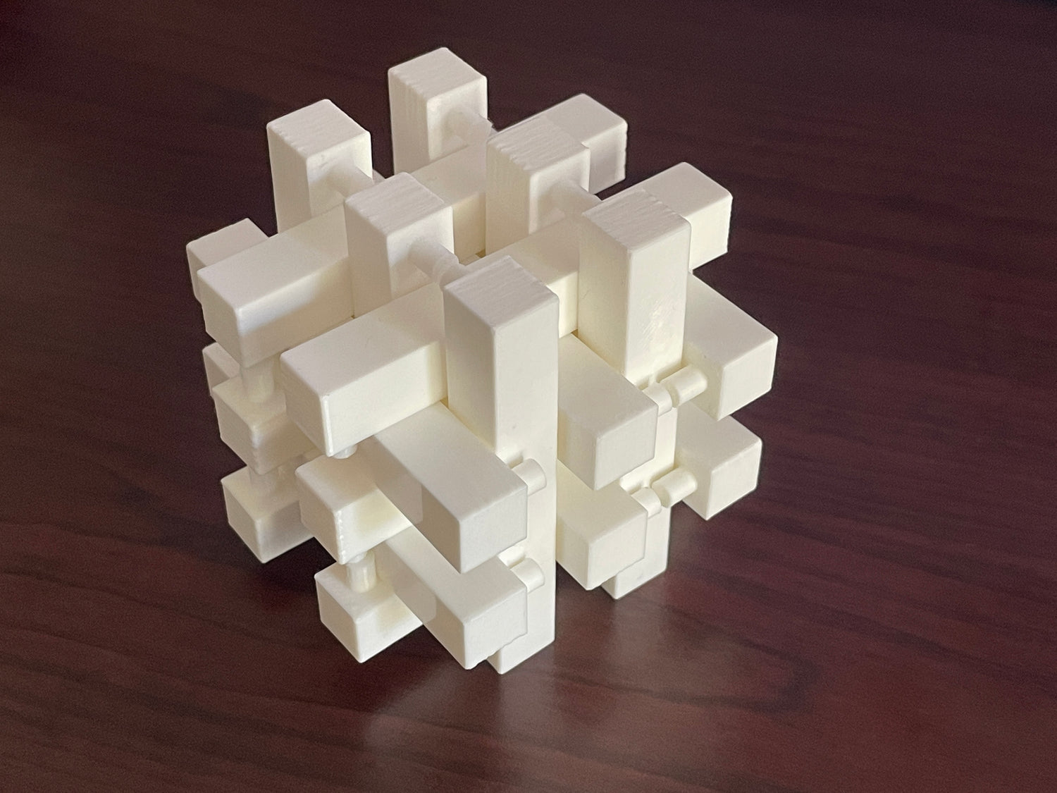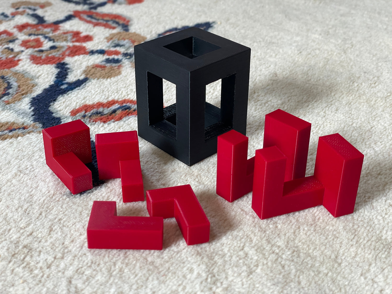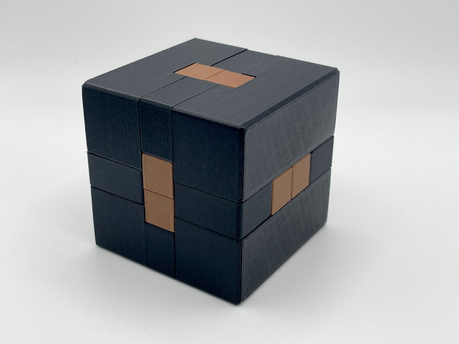 This medium-difficulty kumiki-style puzzle involves sliding pieces, aligning notches, and having a firm understanding of the whole interlocking structure to figure out how the pieces all fit together. I designed the pieces to fit tightly and snugly for an enjoyable experience assembling the cube. Sliding the final piece into place even has a satisfying “click!” and the pieces will stay together without any glue or rubber bands.