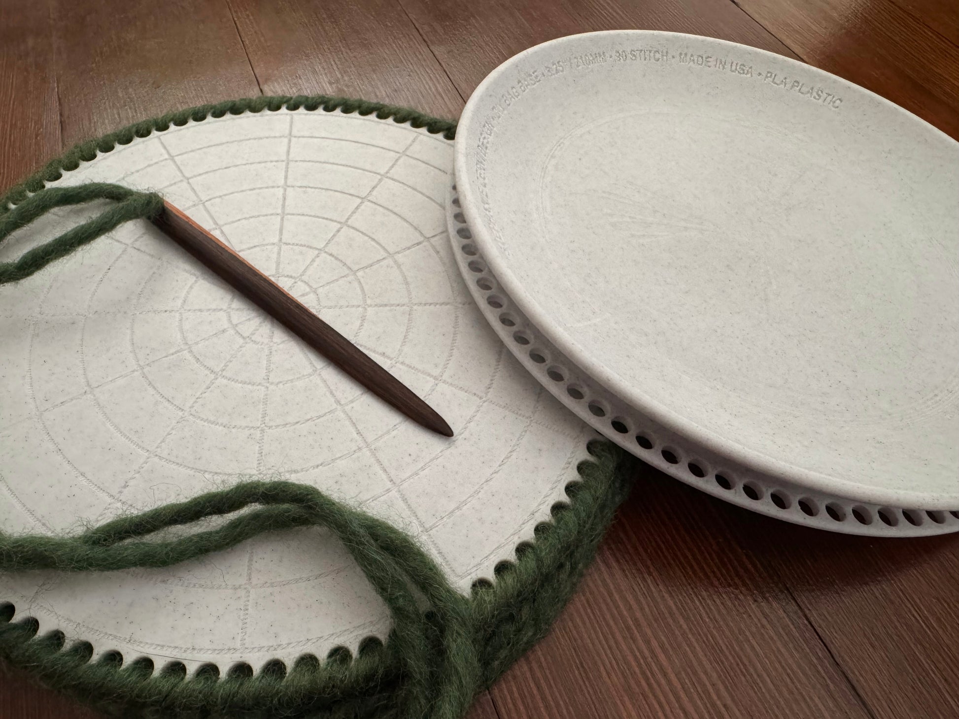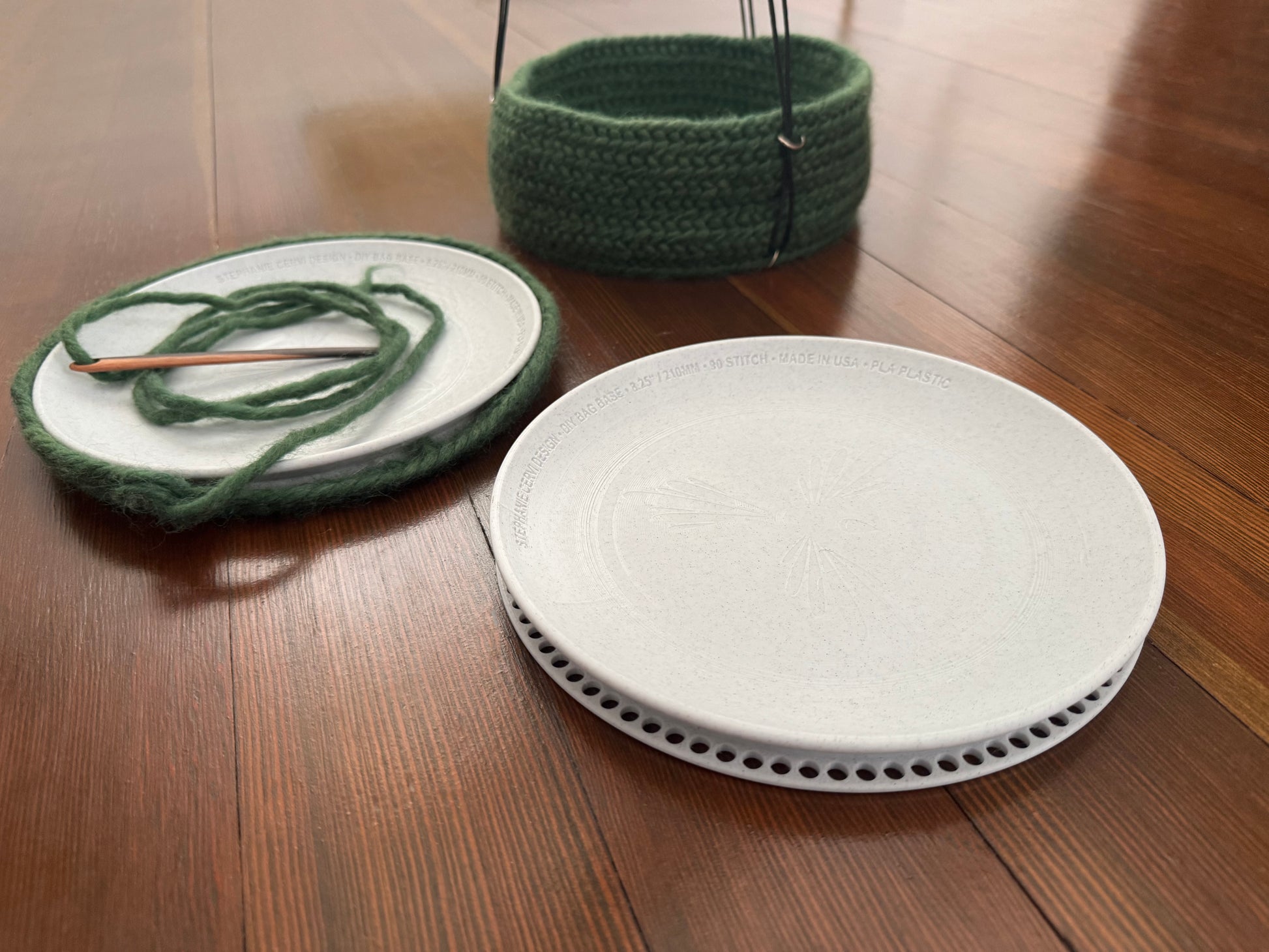 The shallow bowl profile creates a sturdy, durable, rigid bottom for your basket or bag, and prevents any contents from slipping out through the attachment holes. An optional alignment grid set into the bottom surface helps keep rounds even and flat when working in in a spiral to fully cover the bottom surface of the base.