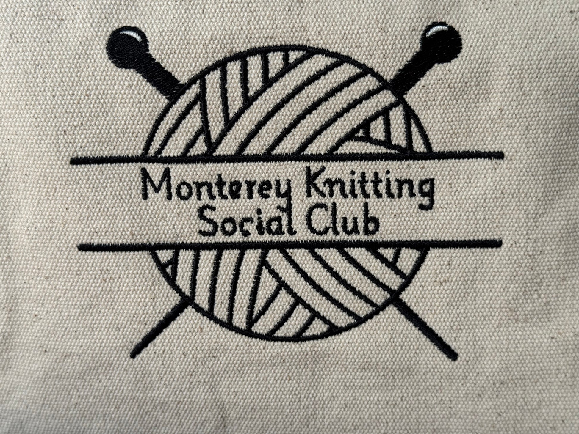 The bag features the Monterey Knitting Social Club logo embroidered in black thread on the front of the bag, with fabric stabilizer on the reverse side for added durability.