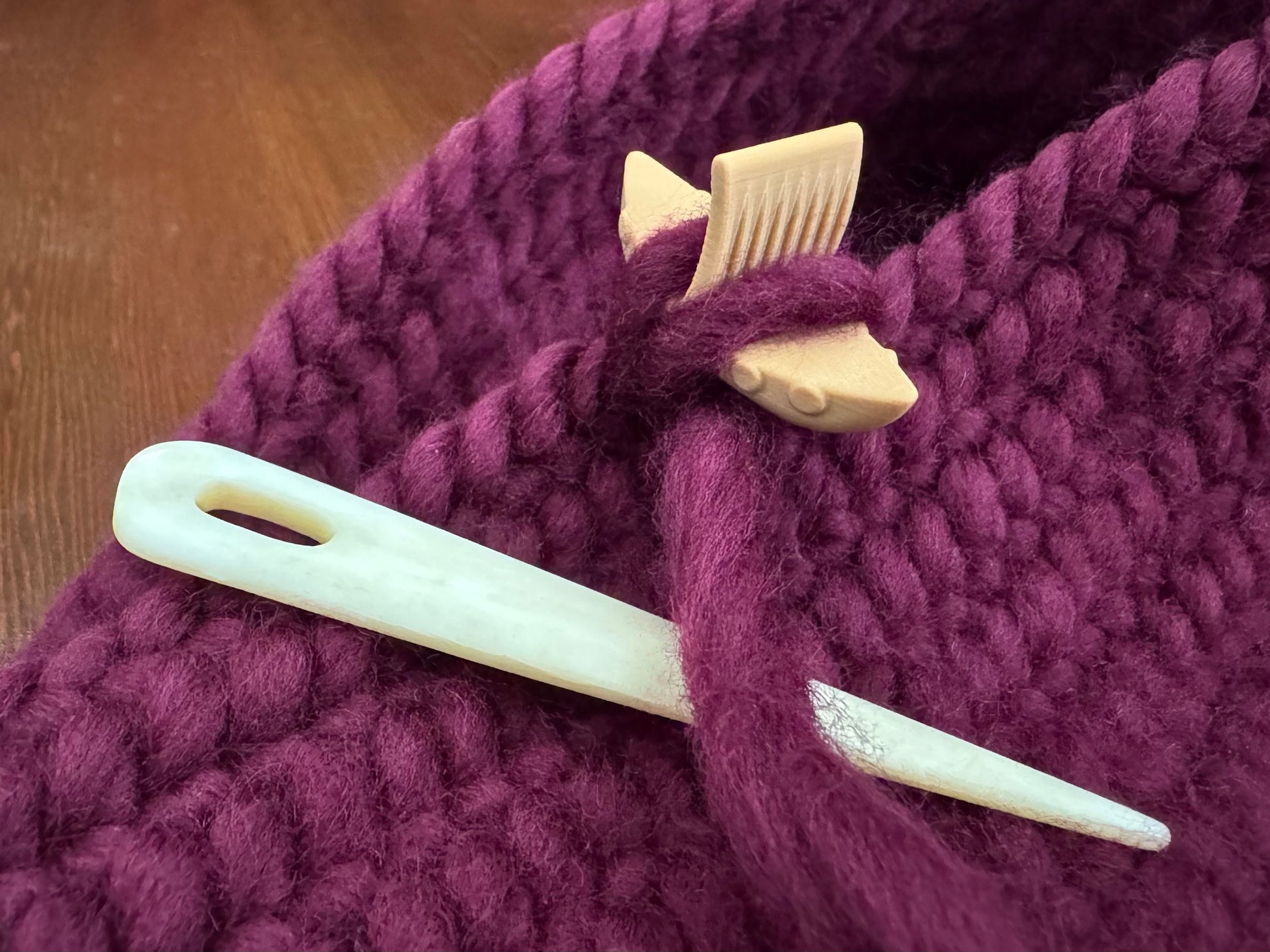 A few solutions already exist: a small stick, removable knitting/crochet stitch markers, or even the nalbinding needle itself. But I wanted something more fun, more secure, and less likely to snag on the fibers of the yarn. I also wanted to be able to more easily tell which loop was the front and which was the back.