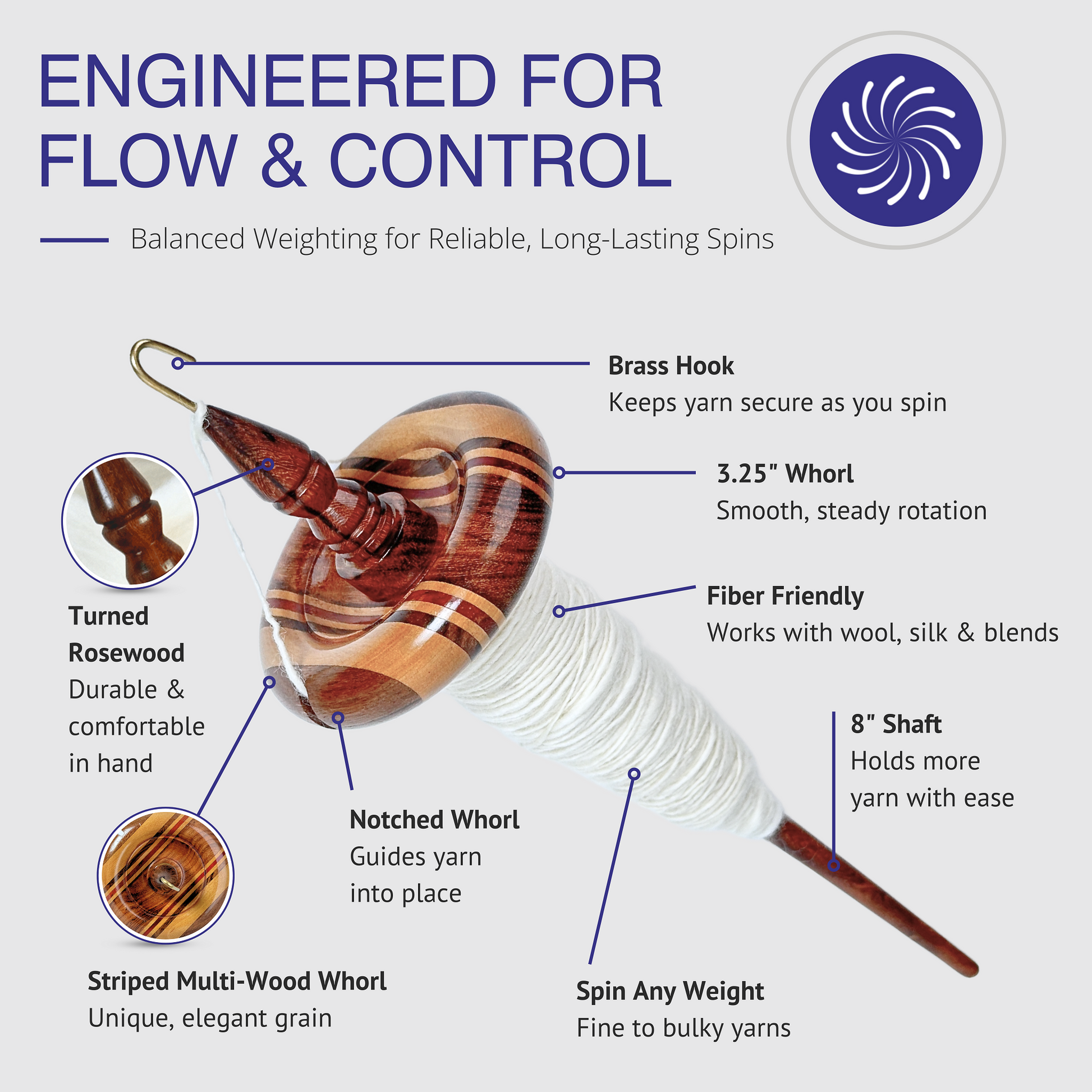 Efficiency in Design: Our top-whorl design, available in captivating variations like Rosewood Flora, Multi-Wood Stripes, and Multi-Wood Frusta, ensures faster spinning, letting you produce more in less time.