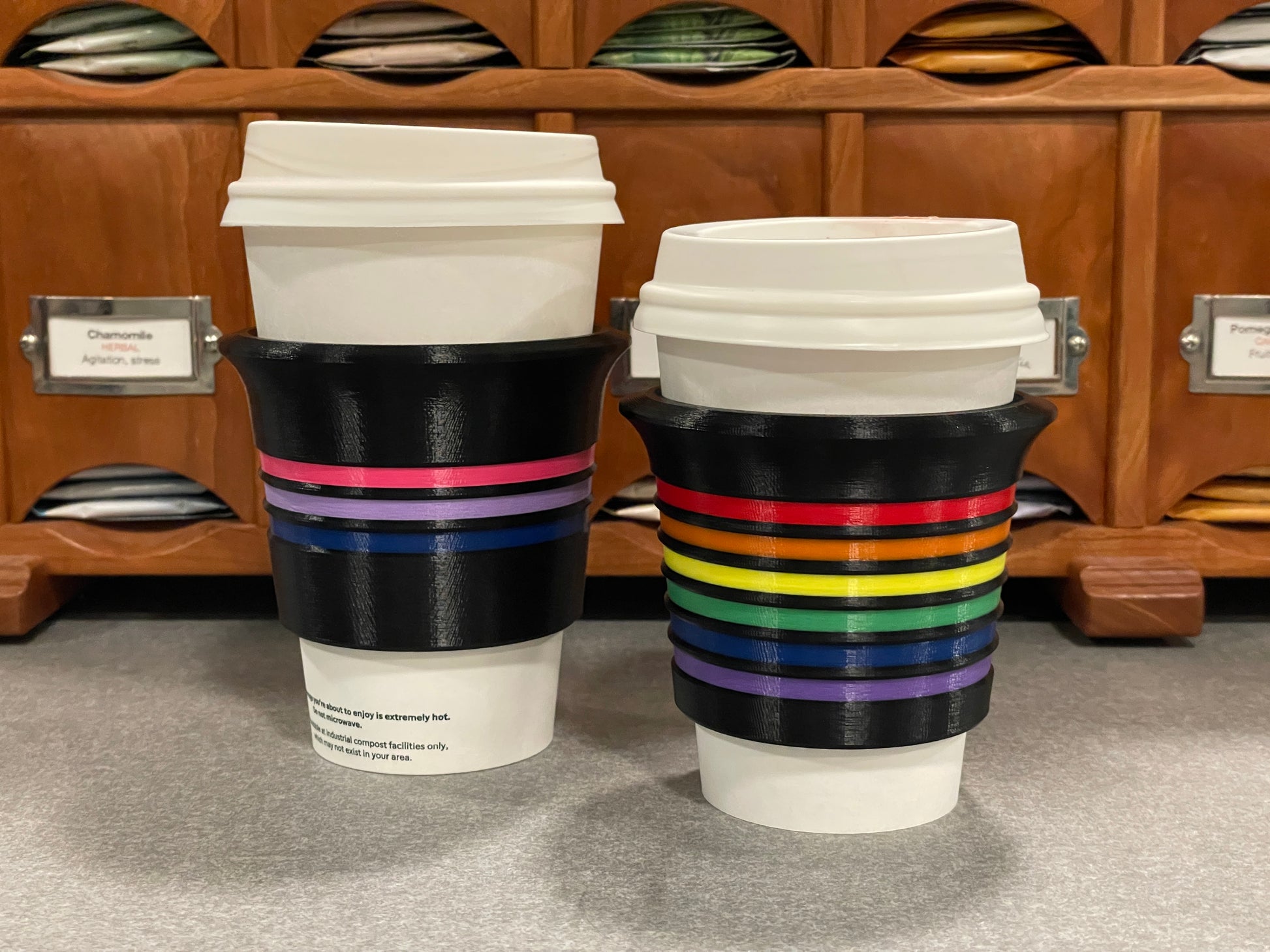 I prefer to print these in ABS or PETG for better heat resistance. Please note that if you make these sleeves from PLA plastic, it may get slightly soft at the temperatures tea is brewed at (above 180ºF/82ºC). I haven't noticed any issues in my product testing as long as you leave the sleeve on the cup until it's cooled. At coffee temperatures, there's no need to worry since that's below the temperature that the plastic starts to get malleable.