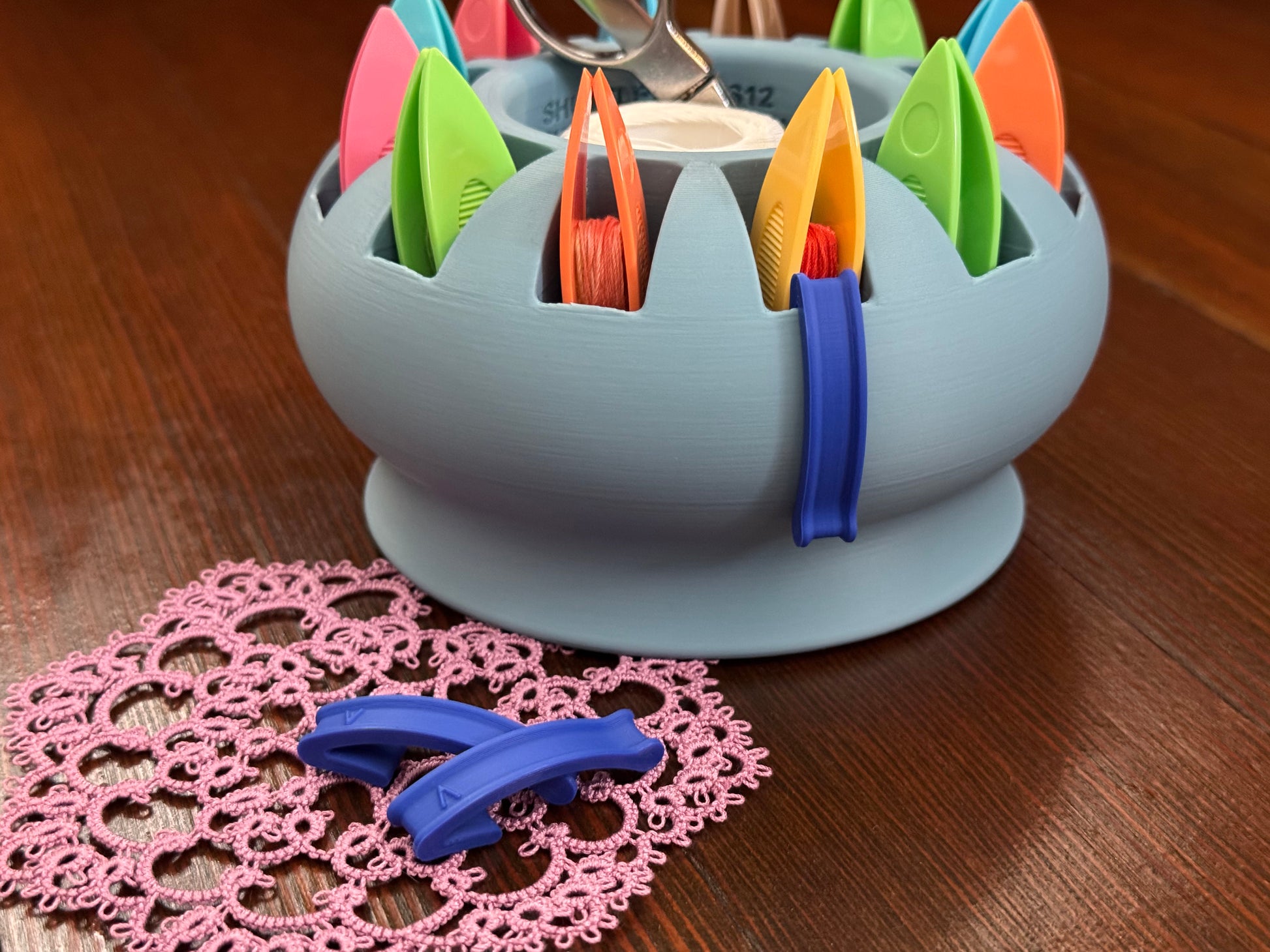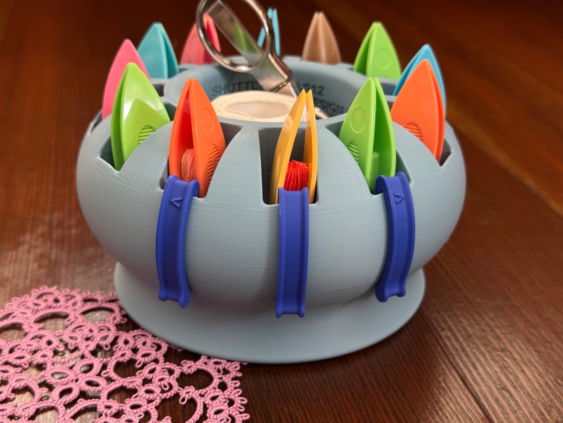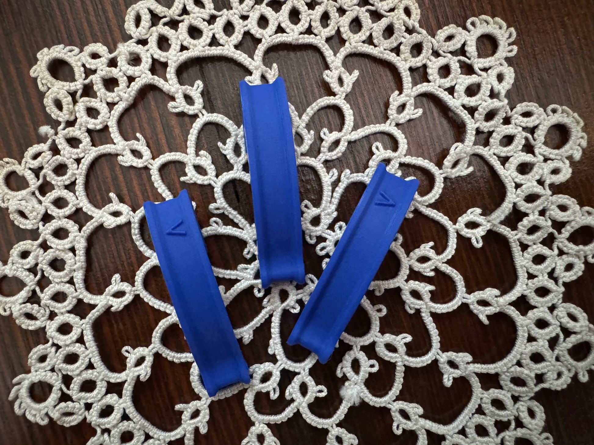 Prevent frustration and confusion with this simple place marker for your ShuttleShip. The Landing Gear clip rests on the outside of a shuttle slot, clearly marking where you left off in your latest helix tatting project. It's lightweight, easy to pick up and move, and doesn't interfere with removing and placing shuttles in the slots.
