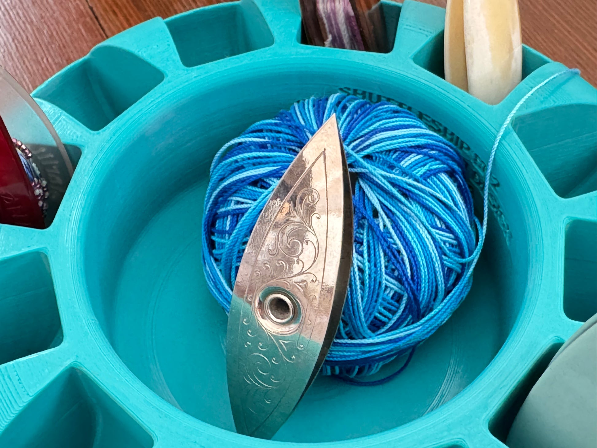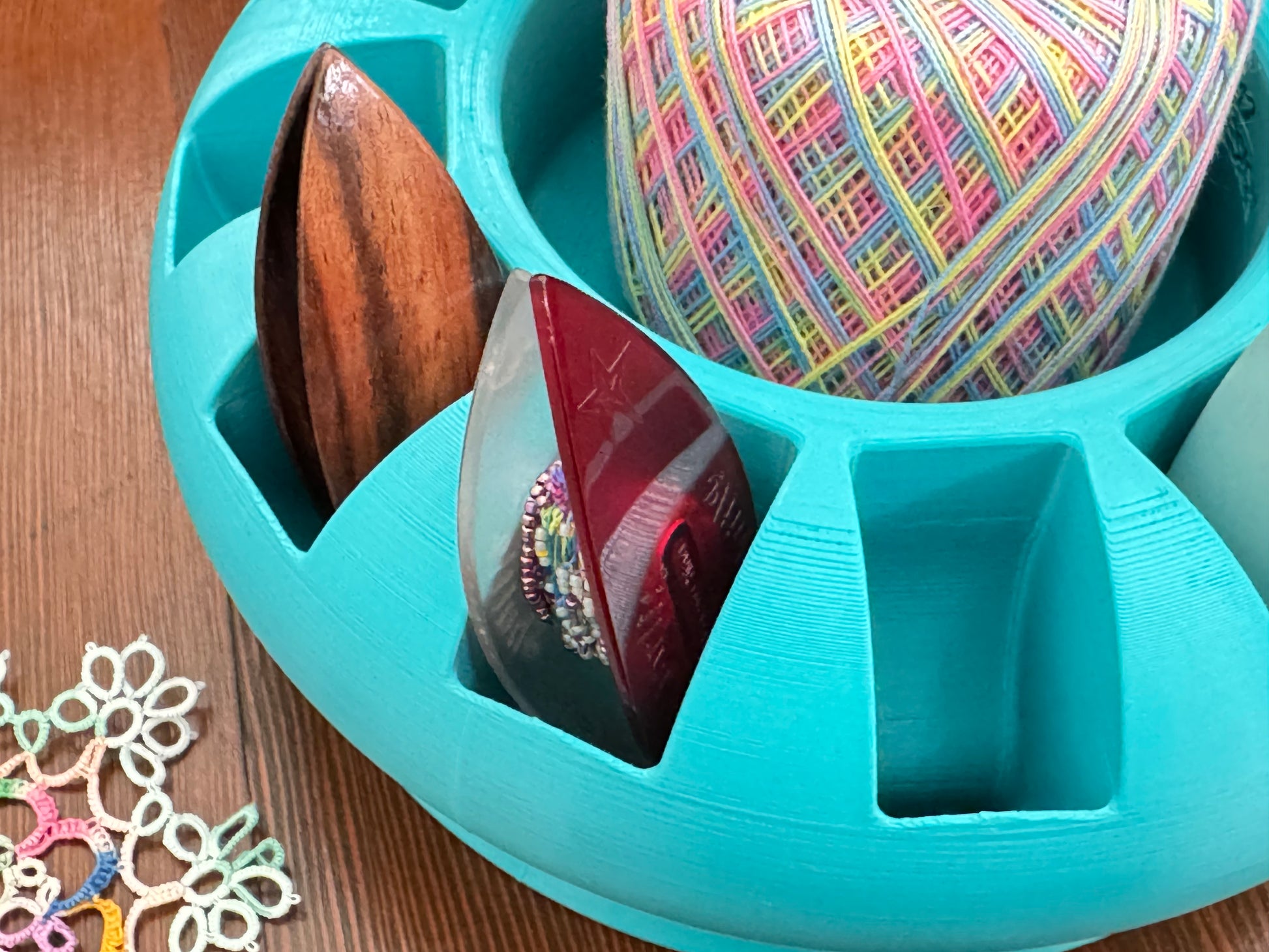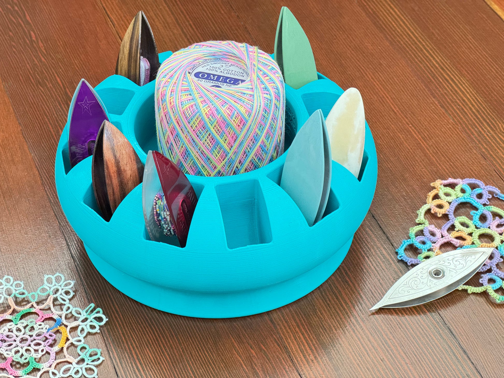 Whether you’re a fan of helix tatting or just want a way to tame the ever-growing pile of shuttles, this shuttle caddy helps you keep them organized and ready for your next project. Its sturdy construction and large, flat base make it stable on any surface. Easily store up to twelve shuttles and your work in progress or a ball of thread.