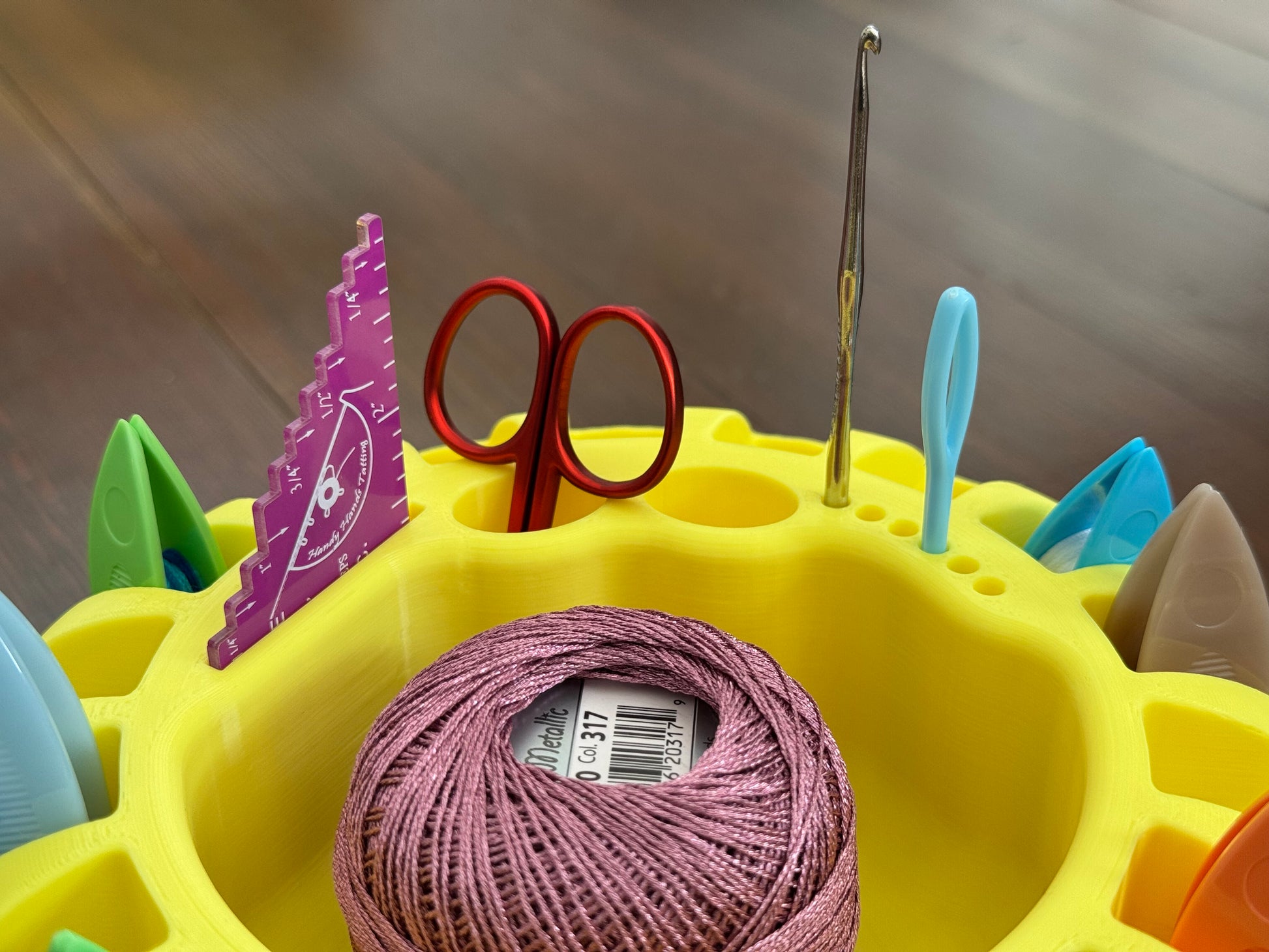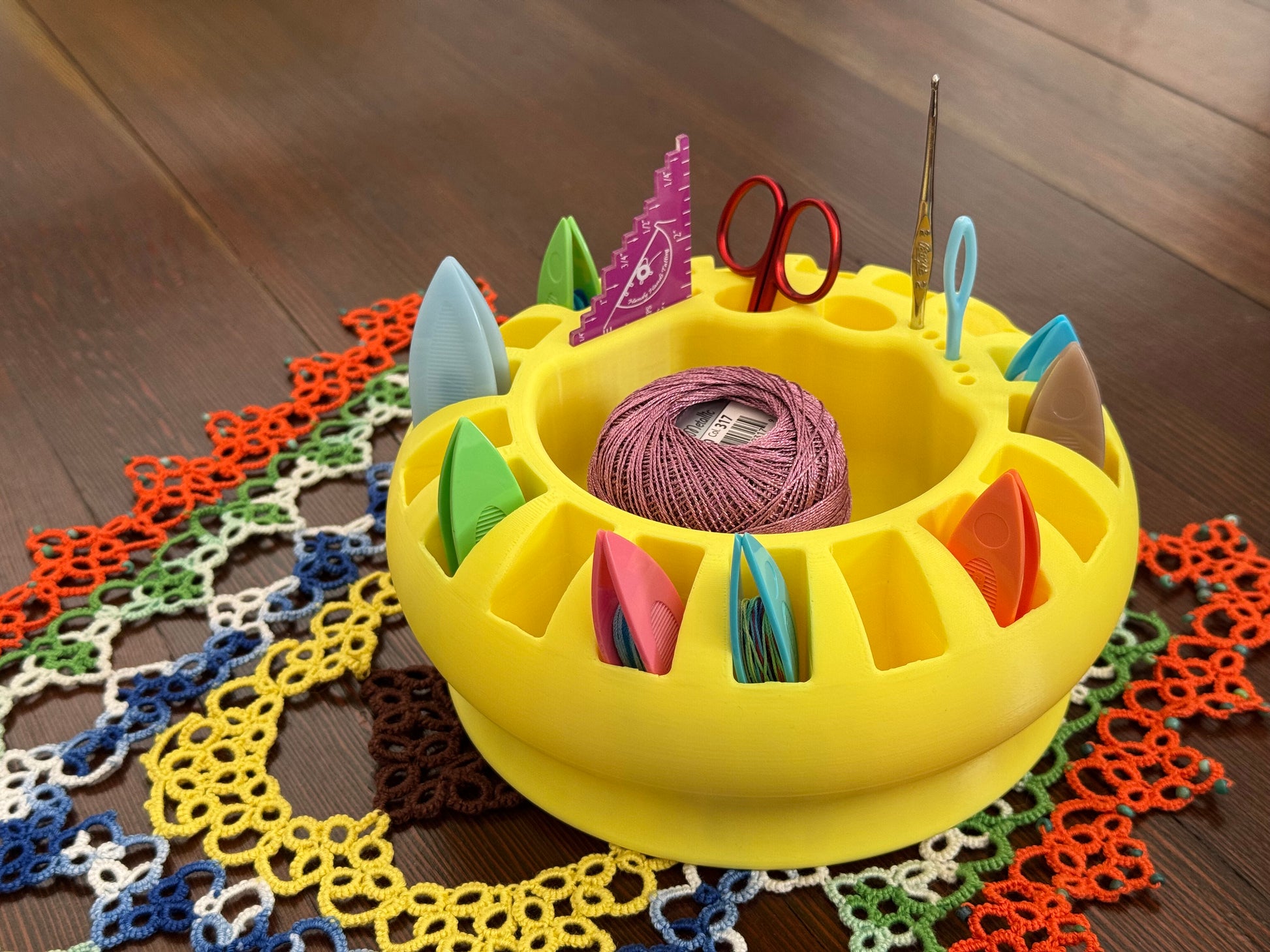 - 6 circular slots for crochet hooks, tatting needles, or tapestry needles