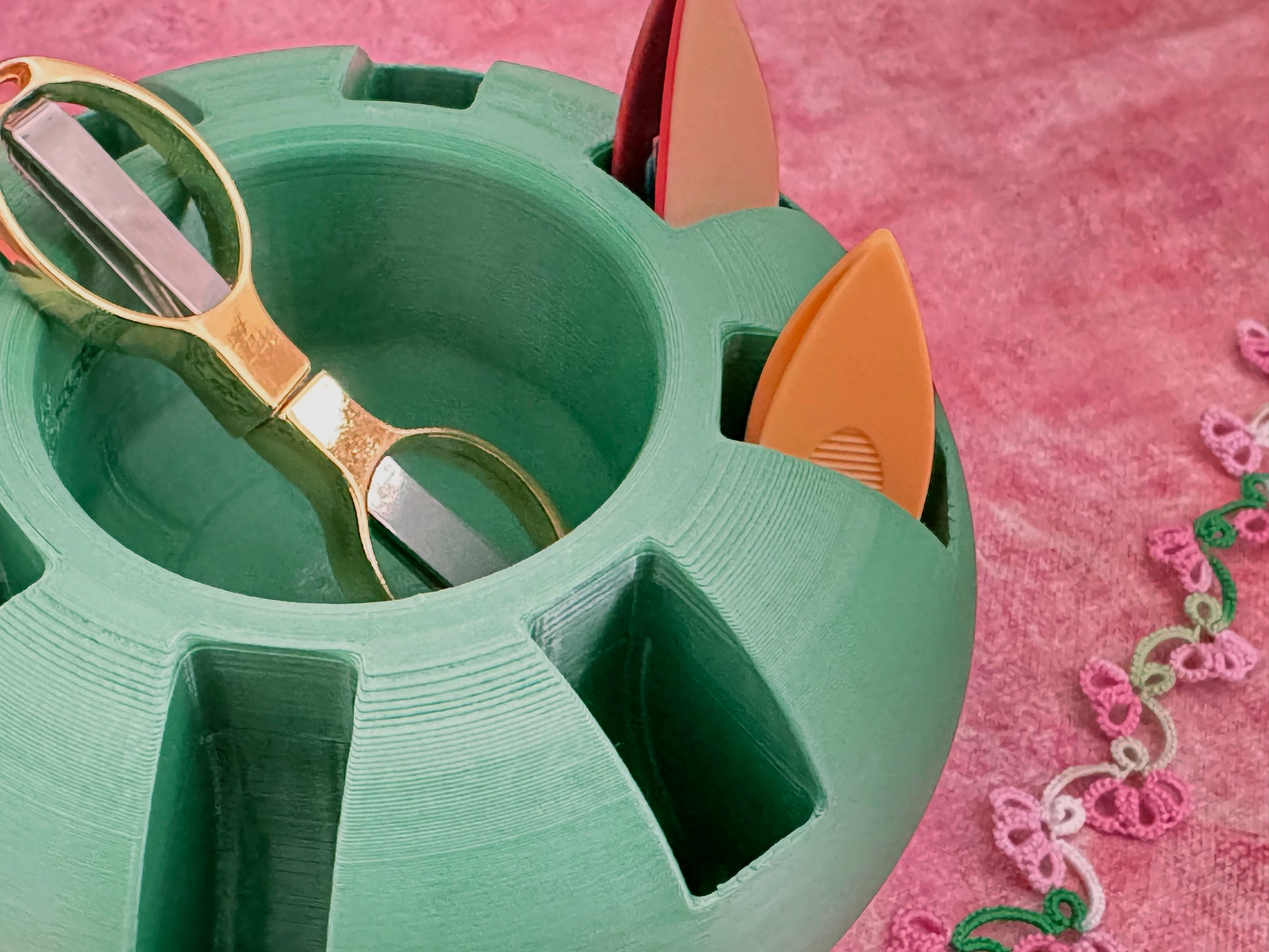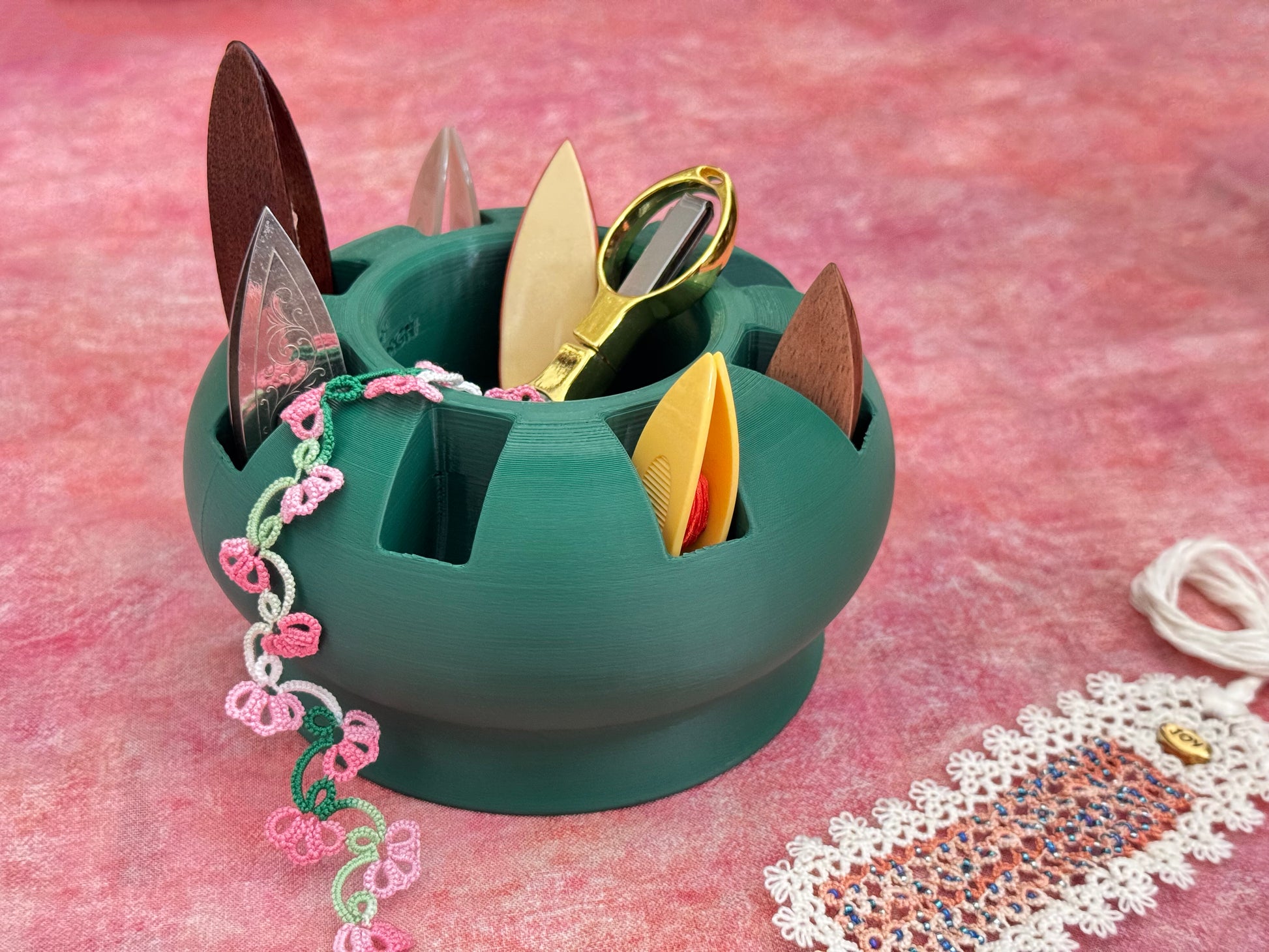Whether you’re a fan of helix tatting or just want a way to tame the ever-growing pile of shuttles, this shuttle caddy helps you keep them organized and ready for your next project. Its sturdy construction and large, flat base make it stable on any surface. Easily store up to eight shuttles and your work in progress or a ball of thread.