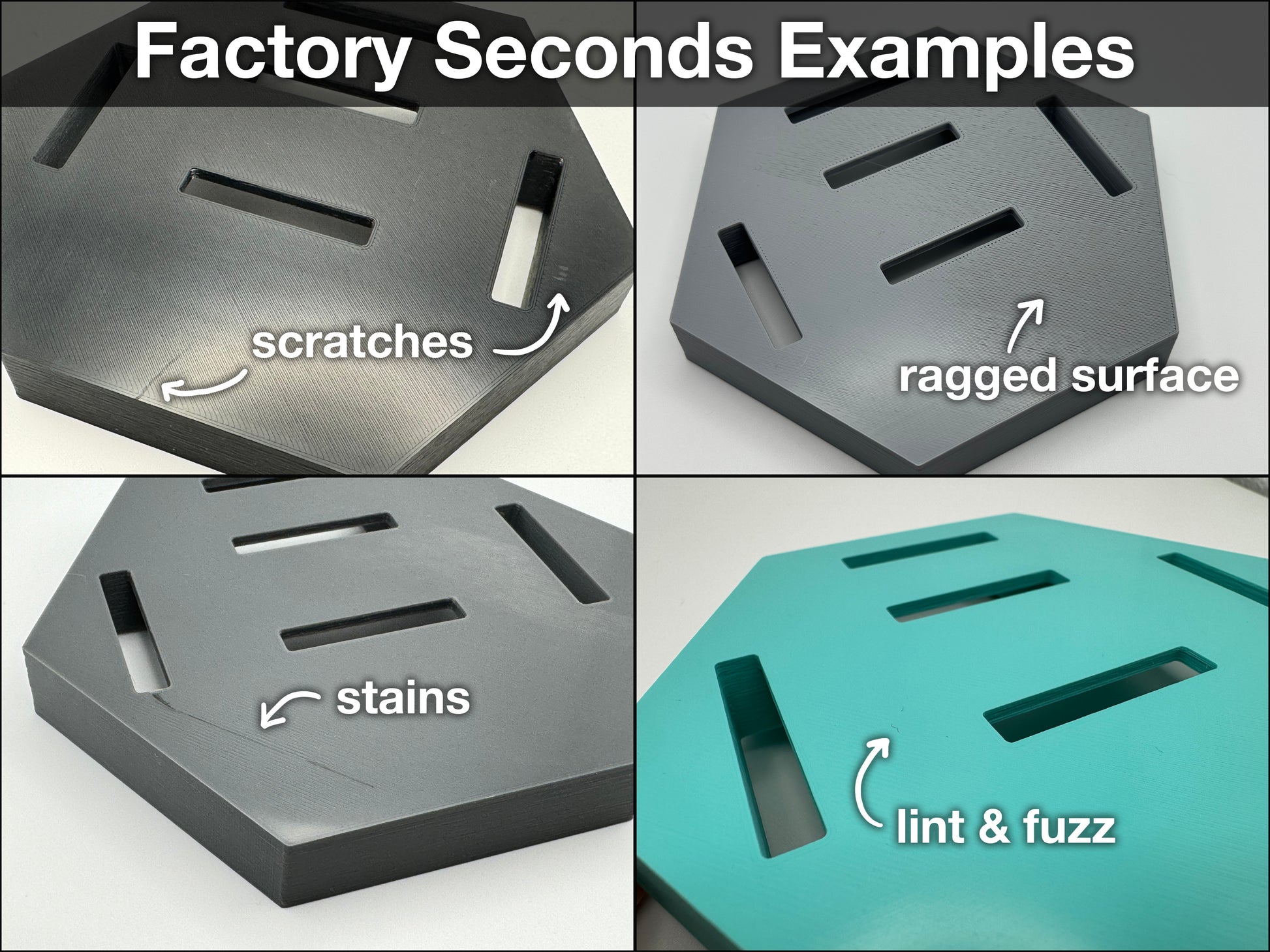 These plaques are fully functional but have some cosmetic flaws (burbles or globs in the finish, significant discoloration, layer shifting, a cat hair got stuck in it, etc). Perfect for covering with felt or velvet for an extra classy feel. They work as intended, but are less attractive. I don't intentionally produce lower-quality products, so these will only be "in stock" when there is a printing issue.