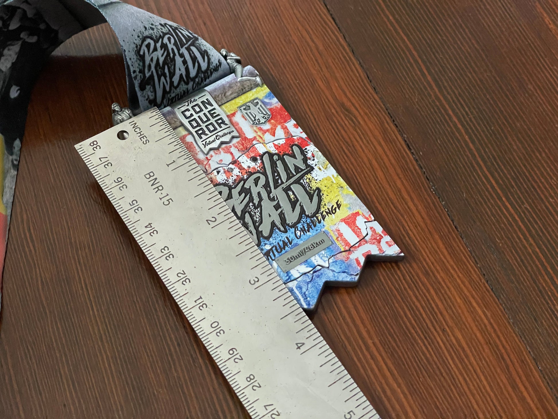 To determine the size of your medals, measure them from where the ribbon attaches to the medal to the bottom-most part of it (see photos for visual how-to). Conqueror Challenge and Pacer medals fit most comfortably on a 4" plaque. Please note that different size plaques will not form an even honeycomb grid, and will not mix and match easily.