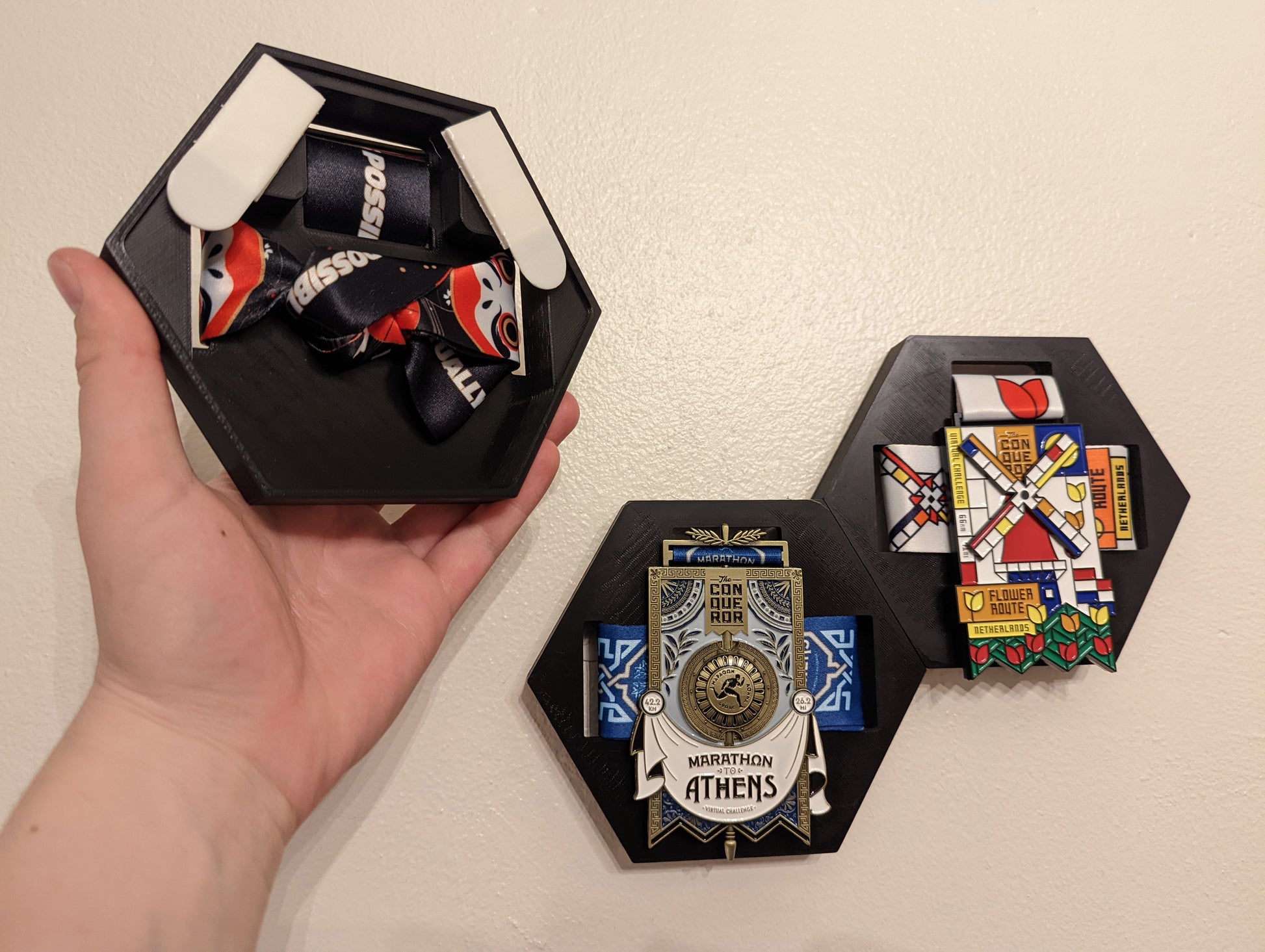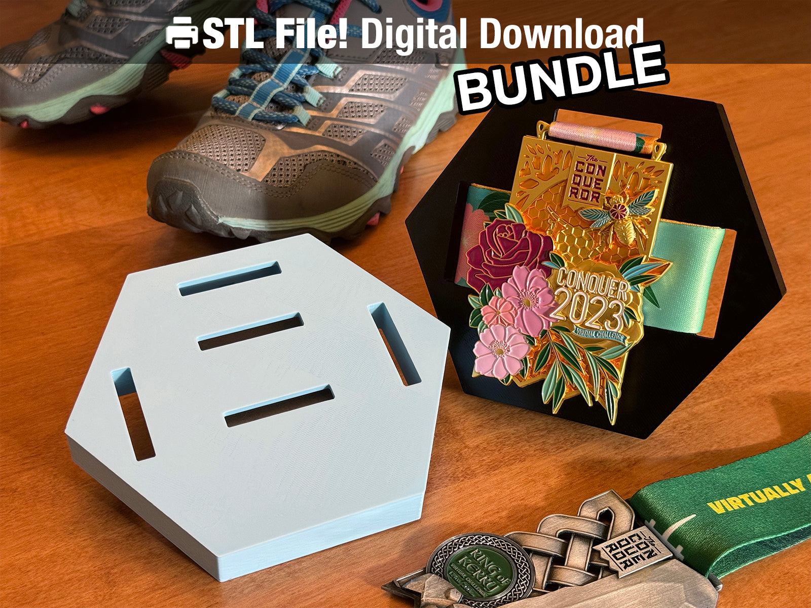 Sized for 3″ to 7″ medals (Conqueror Challenge and Pacer are most comfortable on 4″ plaques). Files are available individually, or as a bundle of all sizes. To determine the size of your medals, measure them from where the ribbon attaches to the medal to the bottom-most part of it. Please note that different size medal display plaques will not form an even honeycomb grid, and will not mix and match easily.
