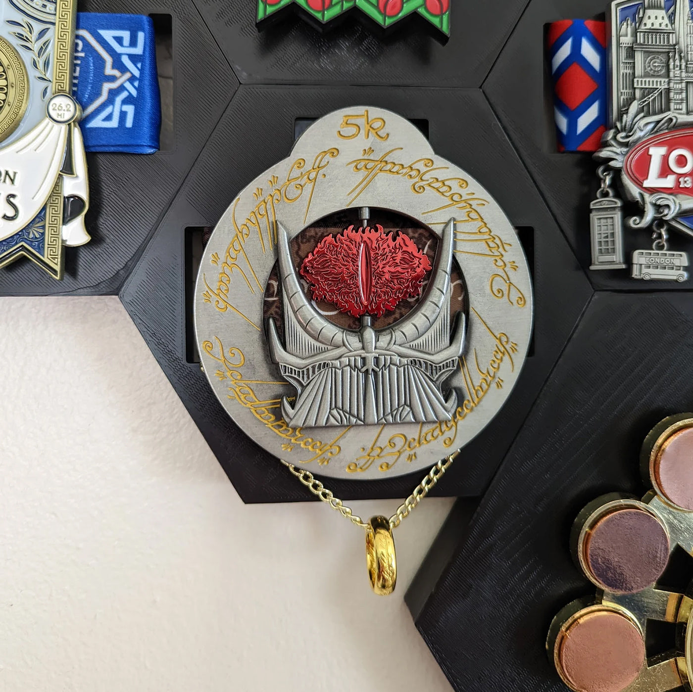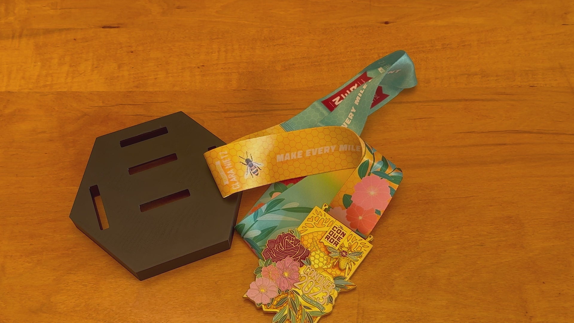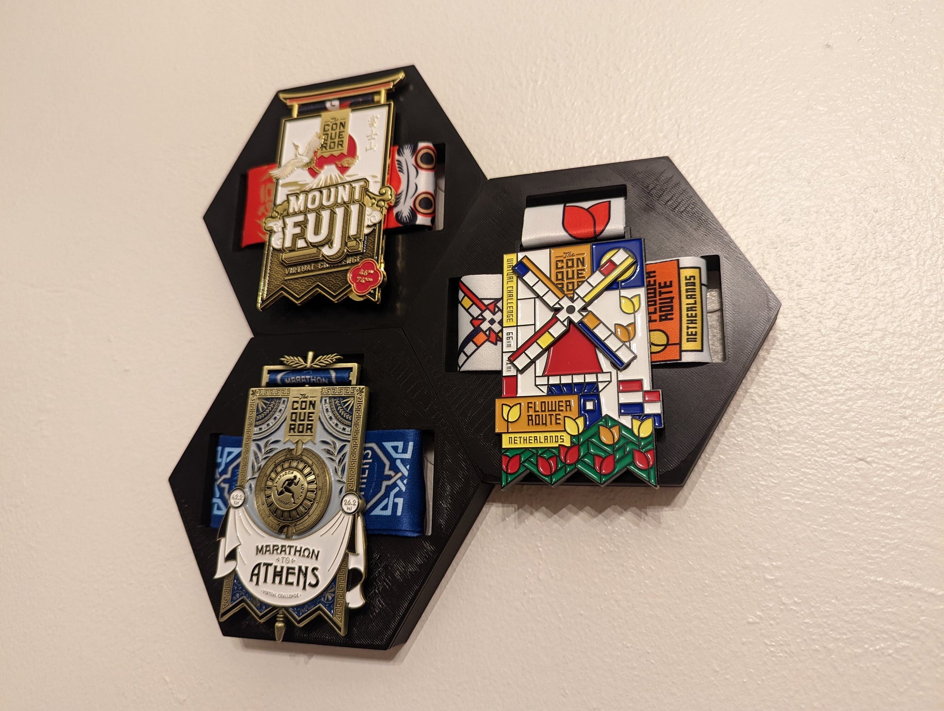 These modular medal display plaques are based on the official hexagon honeycomb setup offered by The Conqueror Challenge and Pacer Virtual Challenges to display your virtual distance challenge medals. Whether you’ve just completed a marathon or are working through virtual races at your own pace, show off your hard-earned medals in style with these easy to hang, single piece plaques. The honeycomb shape lines up easily with plaques you’ve already hung on your wall for a modular, expand-as-you-go brag board.