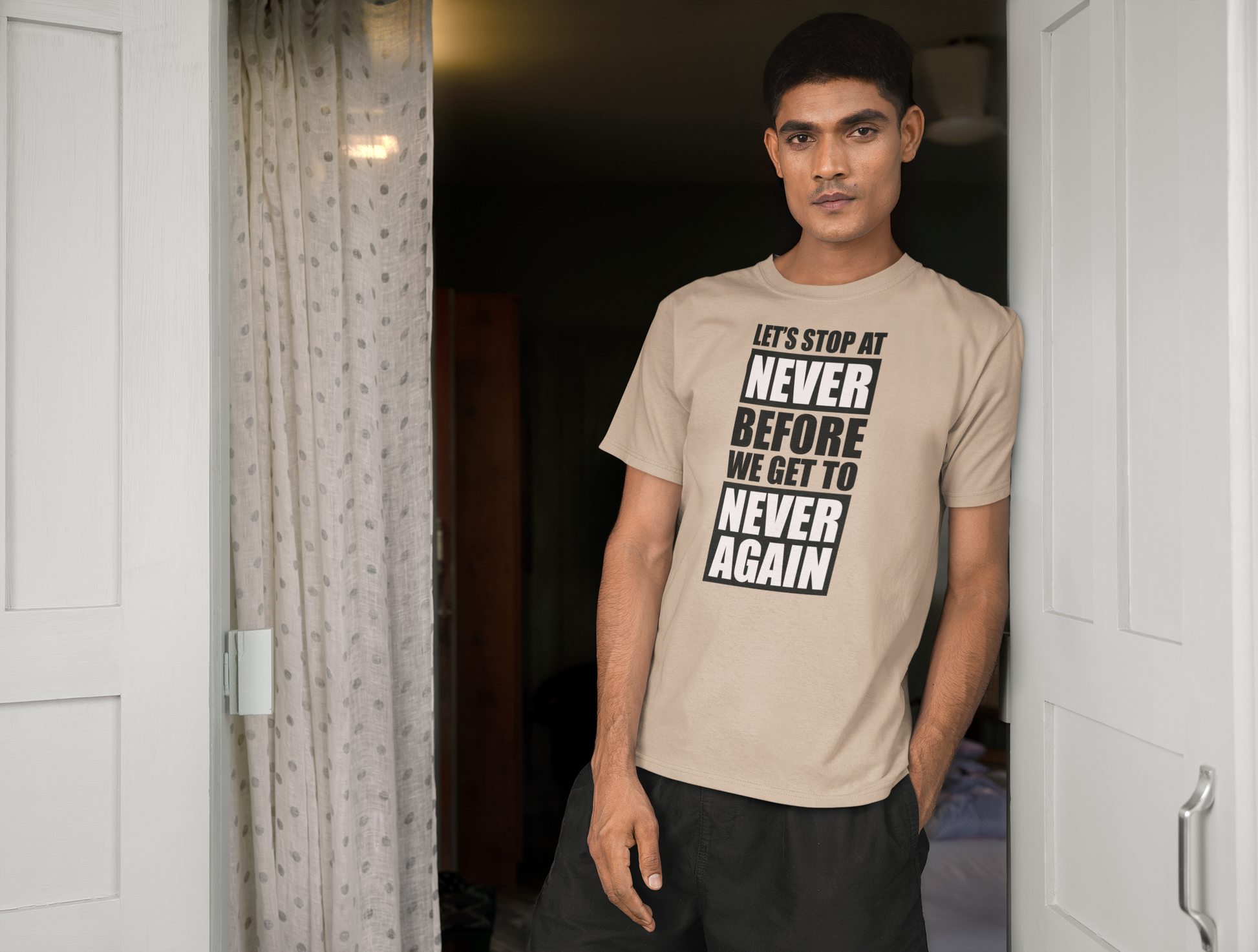 Take a stand against violence, hate, and oppression with this bold statement t-shirt. The world's a dumpster fire, that's obvious, but if we can stop at "never" before we get to "never again" maybe the fire won't burn everything else down too.