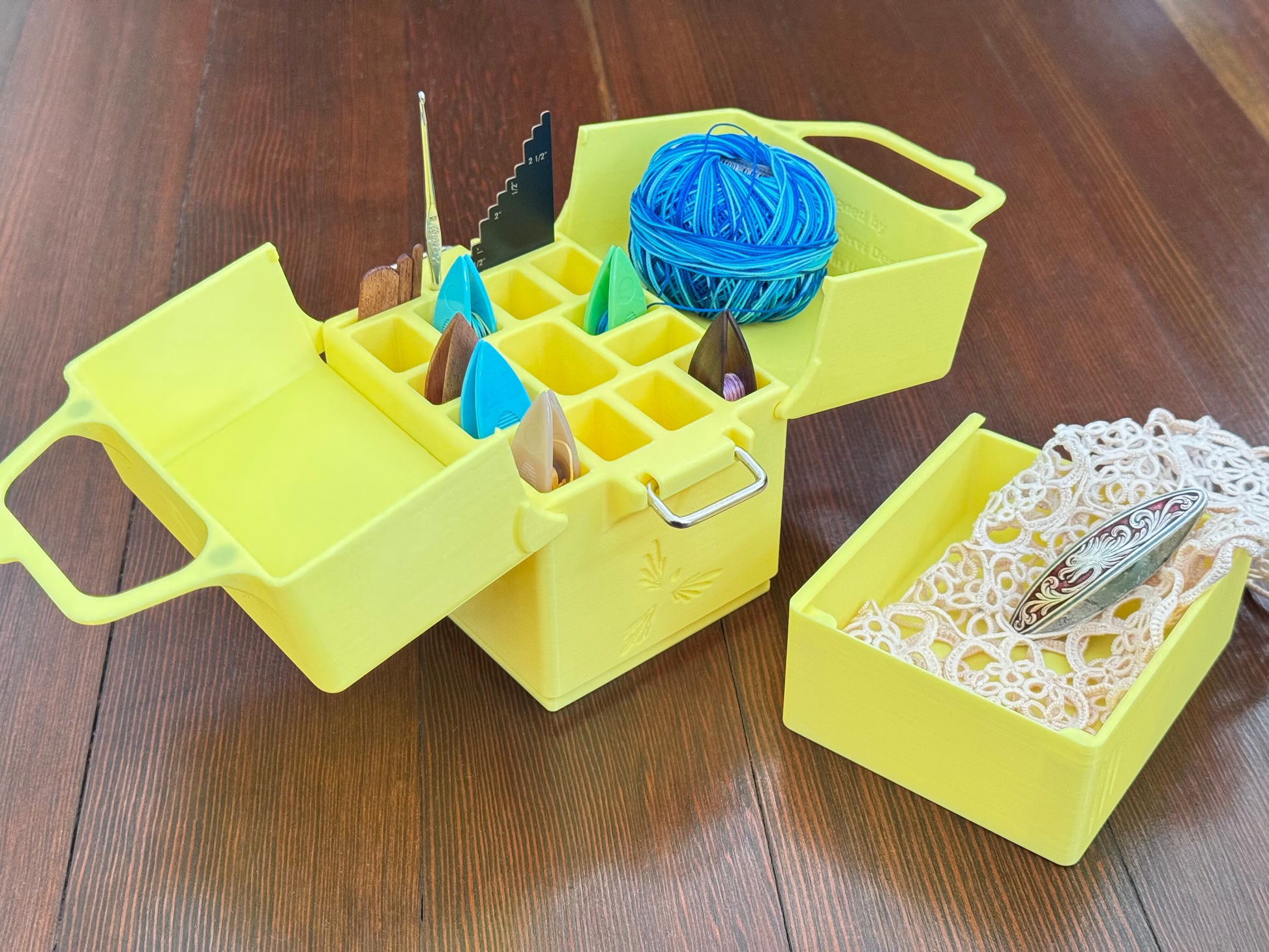 The Helix has rings on either side of the case for easy conversion into a purse, as well as a slide-on, magnet-secured compartment on the base of the toolbox body for larger tools and work in progress. Purse straps are not included with the Tatting Toolbox.