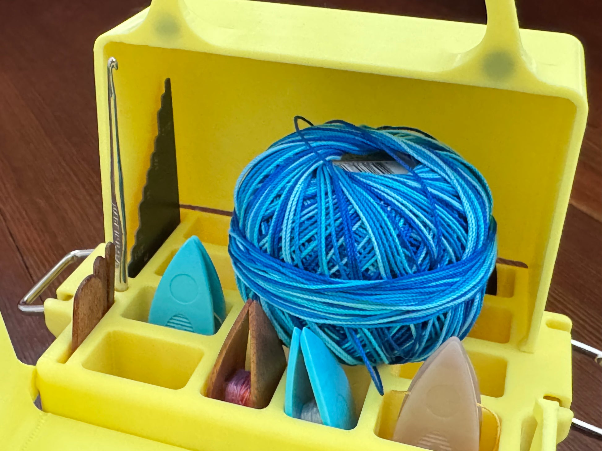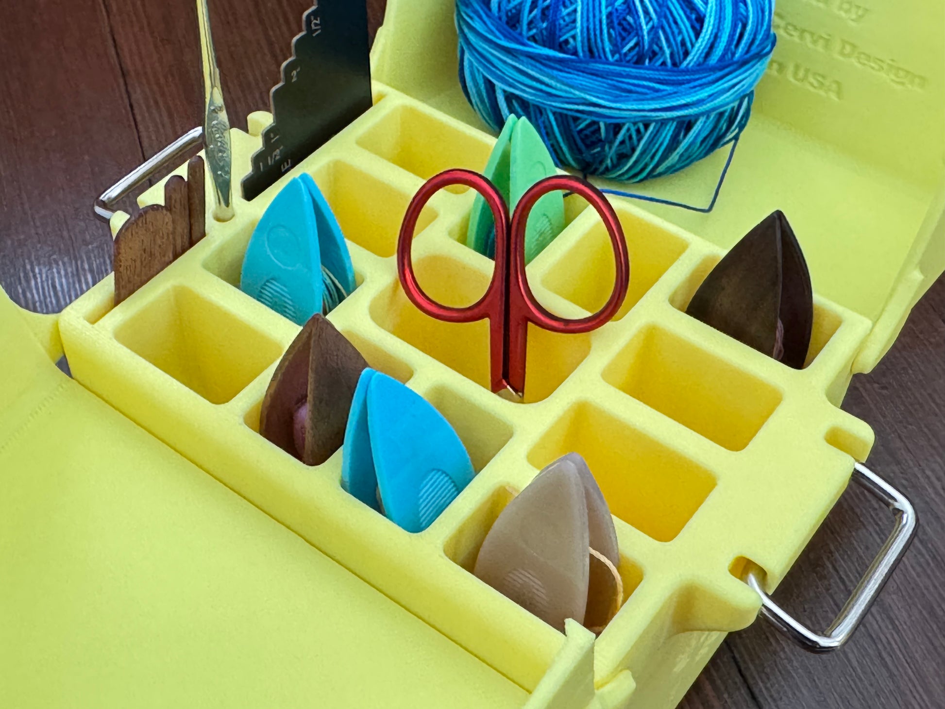 The Tatting Toolbox features a rigid PLA plastic base with molded-in, tapered shuttle slots that set shuttles on their edges instead of their tips to prevent dulling, blunting, and bending. A large number of slots allow for carrying whatever combination of shuttles and tools fit your current project needs. The center slot can hold scissors, a needle case, other tools, or your work in progress, while the small circular slot fits tatting needles of different sizes or a crochet hook.