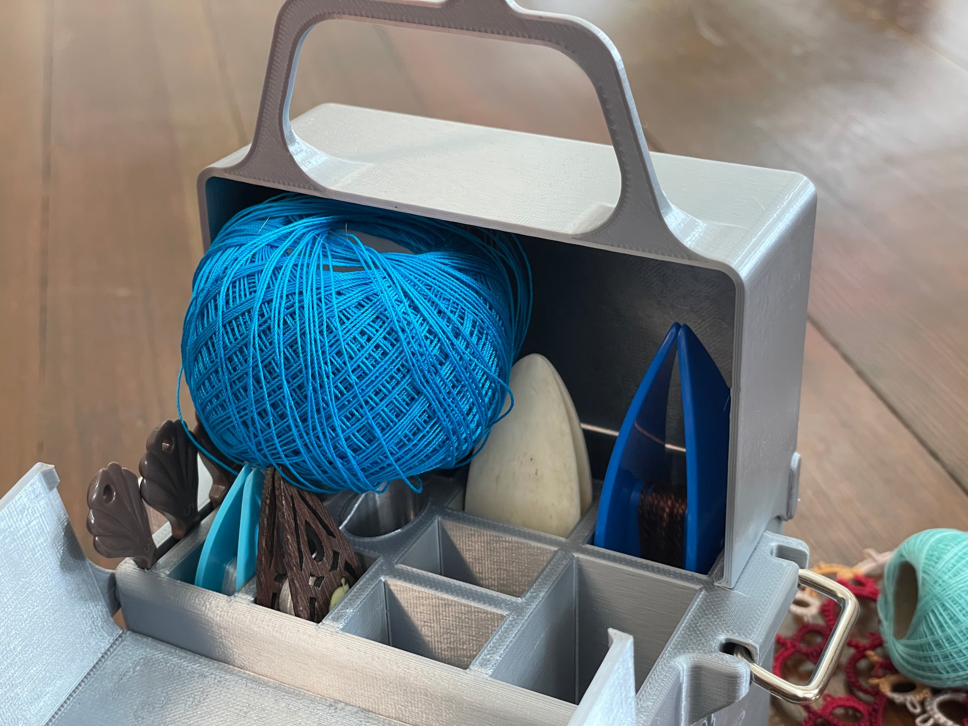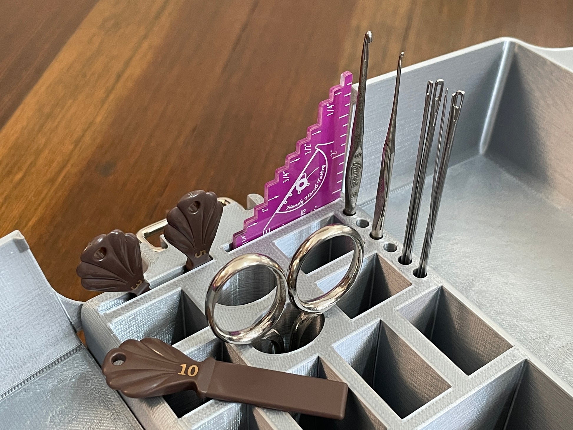 The Tatting Toolbox features a rigid PLA plastic base with molded-in, tapered shuttle slots that set shuttles on their edges instead of their tips to prevent dulling, blunting, and bending. Slots of different shapes and sizes allow for carrying whatever combination of shuttles and tools fit your current project needs. The oval slots can hold scissors, needle cases, and other tools, while the small circular slots fit a full set of tatting needles of different sizes as well as crochet hooks.