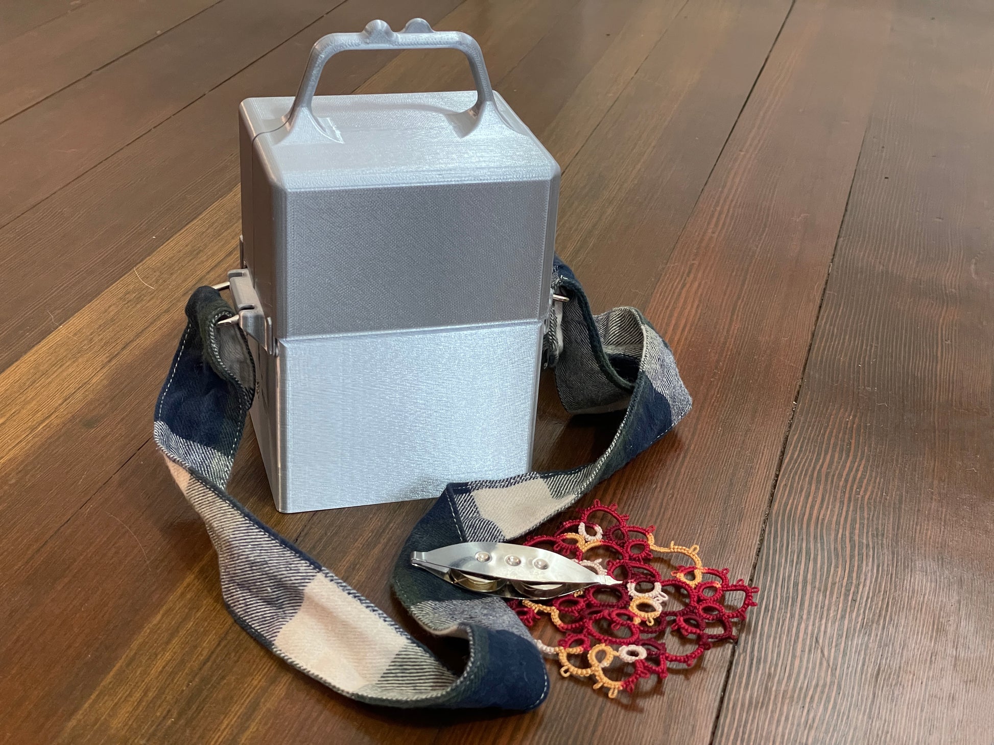 The Empress has rings on either side of the case for easy conversion into a purse, as well as a slide-on, magnet-secured compartment on the base of the toolbox body for larger tools and work in progress. Purse straps are not included with the Tatting Toolbox.