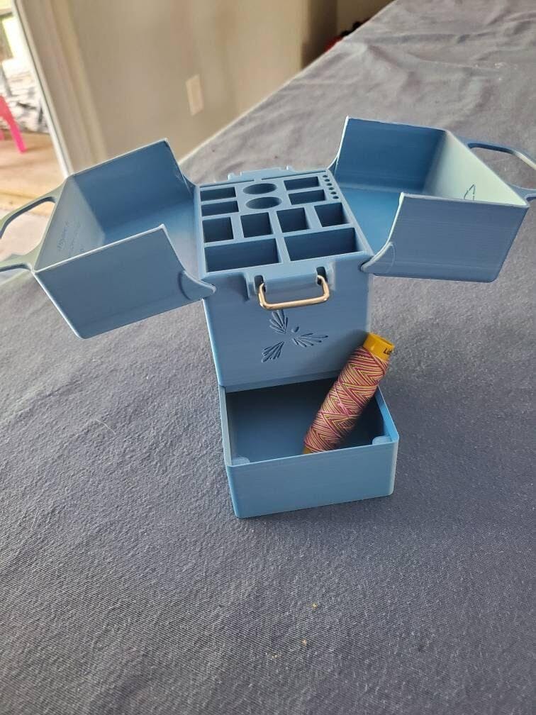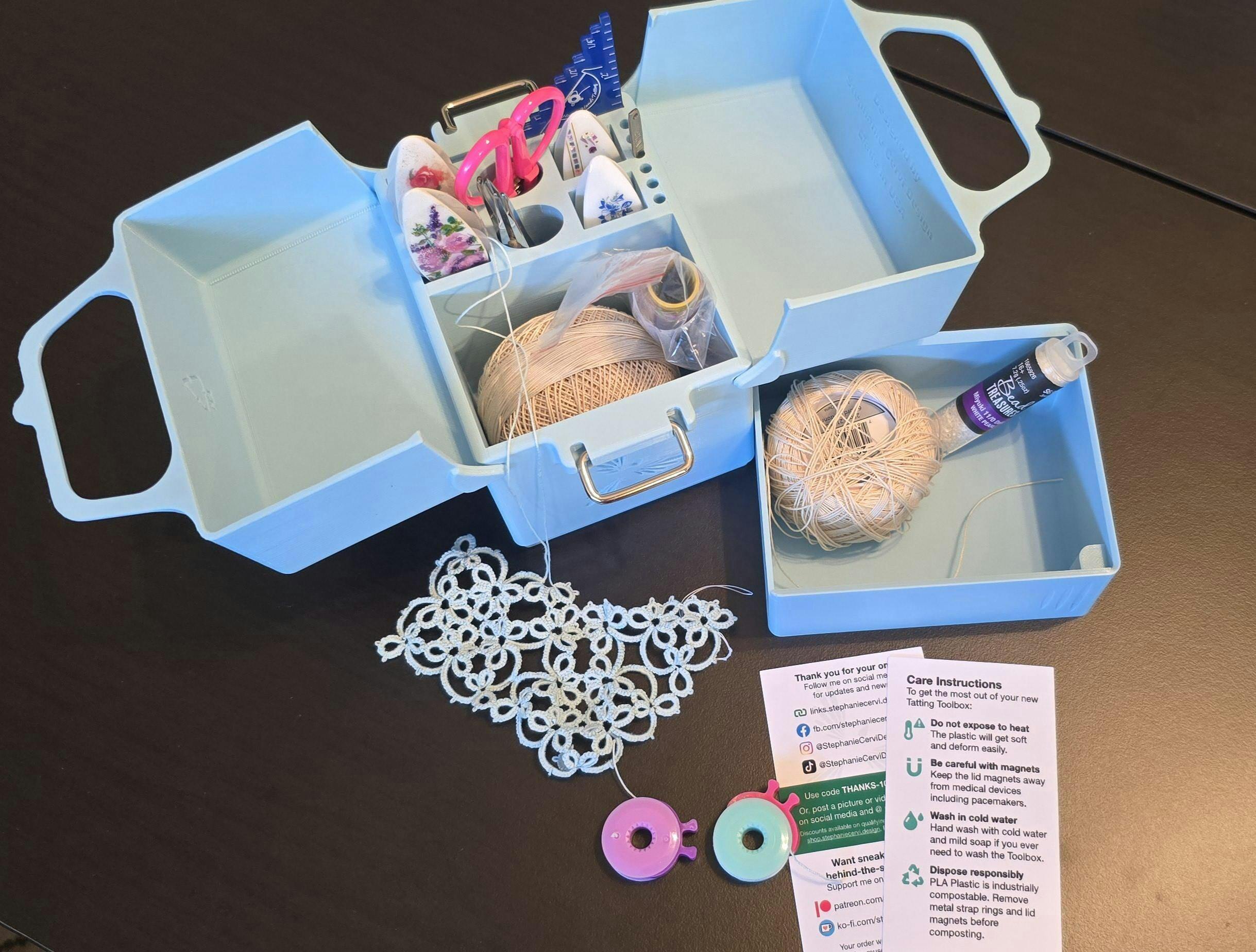 I ordered the blue ombre box that comes with the extra bottom storage space. I like the box a lot as it is a convenient, unique, and cool way to store my tatting supplies. I only have two minor concerns: 1) the ombre isn't vertical, it's horizontal, so the light blue to dark blue looks as though the box had been left in a window and bleached out on one side. An image on the item page would have helped me, and I probably would have just ordered blue. 2) Not all of my Clover picot gauges fit in the top, so they're distributed in different areas of the container. Not a big deal, though I could see myself having a tougher time keeping track of them. Regardless, the item works, looks cool, holds my tatting things, and arrived quickly. Plus, Stephanie sent me complimentary tatting thread which was very kind.
